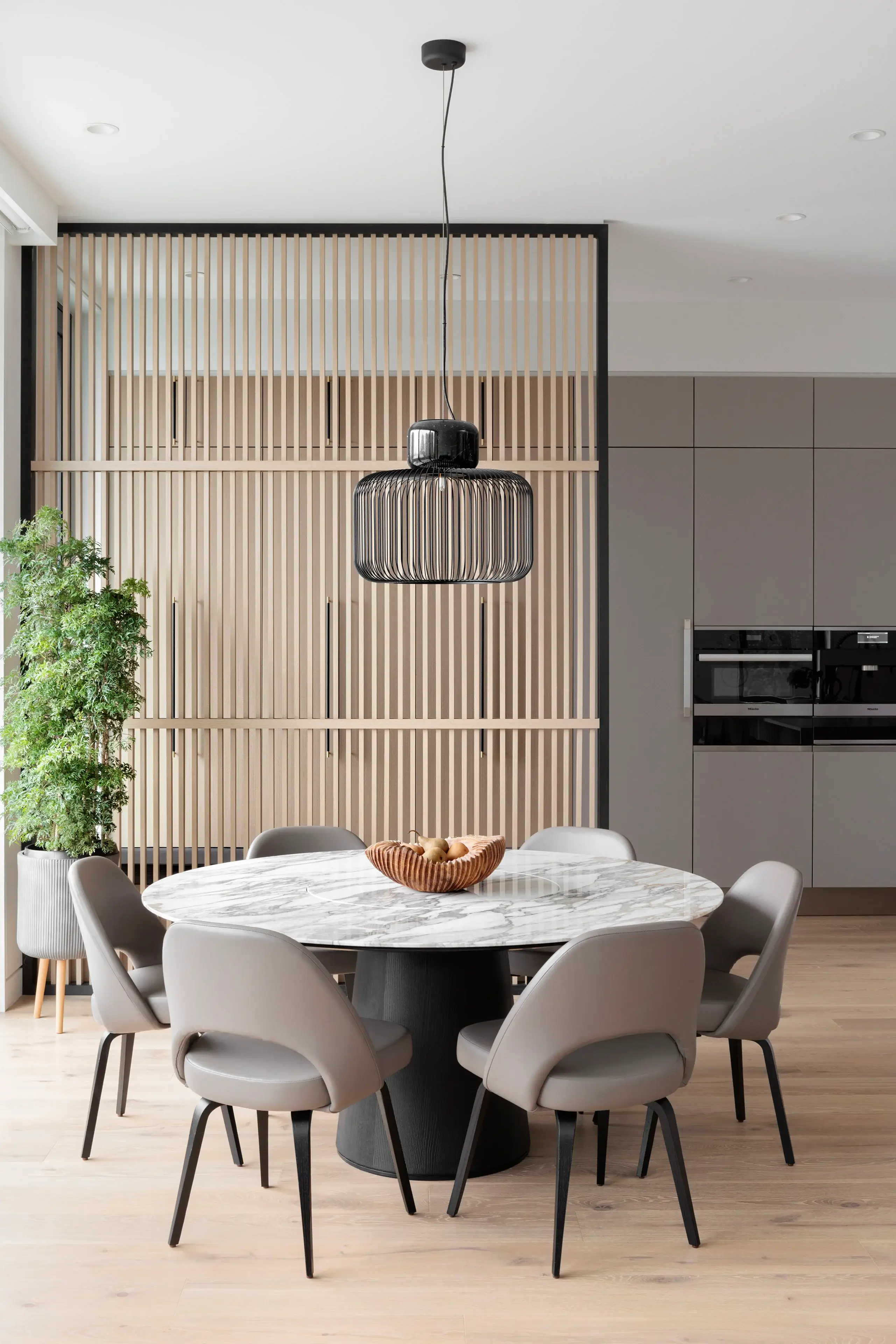 Light and privacy are further managed by a series of slatted walls that reinterpret the Chinese ping feng. At the east facade, the screen filters corner light and shields views from the street. Inside, repeated variations of the motif organize circulation, create a sense of layered separation, and allow natural light to travel across spaces without loss of privacy.